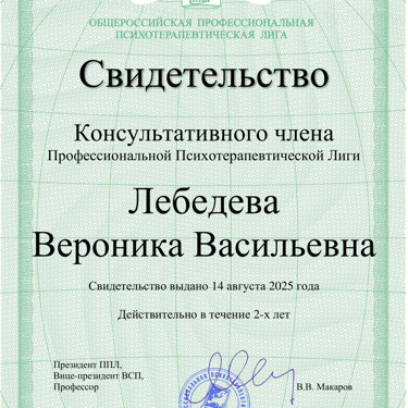 Консультативный член Общероссийской Профессиональной Психотерапевтической Лиги (ОППЛ).